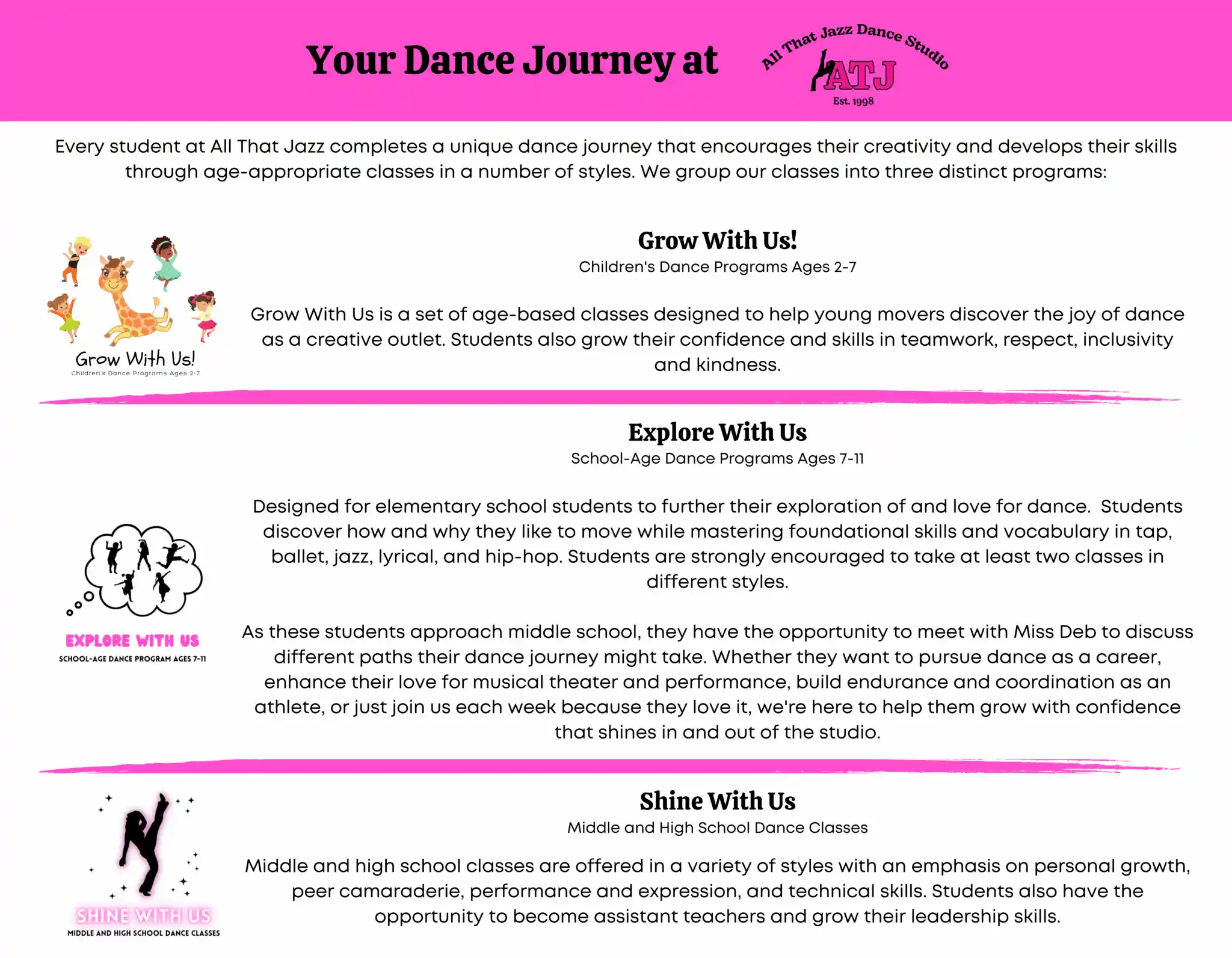 At All That Jazz Dance Studio in Newton, we have a wonderful and varied schedule of classes. Dance class schedule; In Newton includes ballet, tap, jazz, contemporary, hip hop, pointe, musical theater, commercial dance, lyrical, creative movement, pre-ballet/tap, and fairy princess dance for kids. Toddler and little kids dance classes, too!