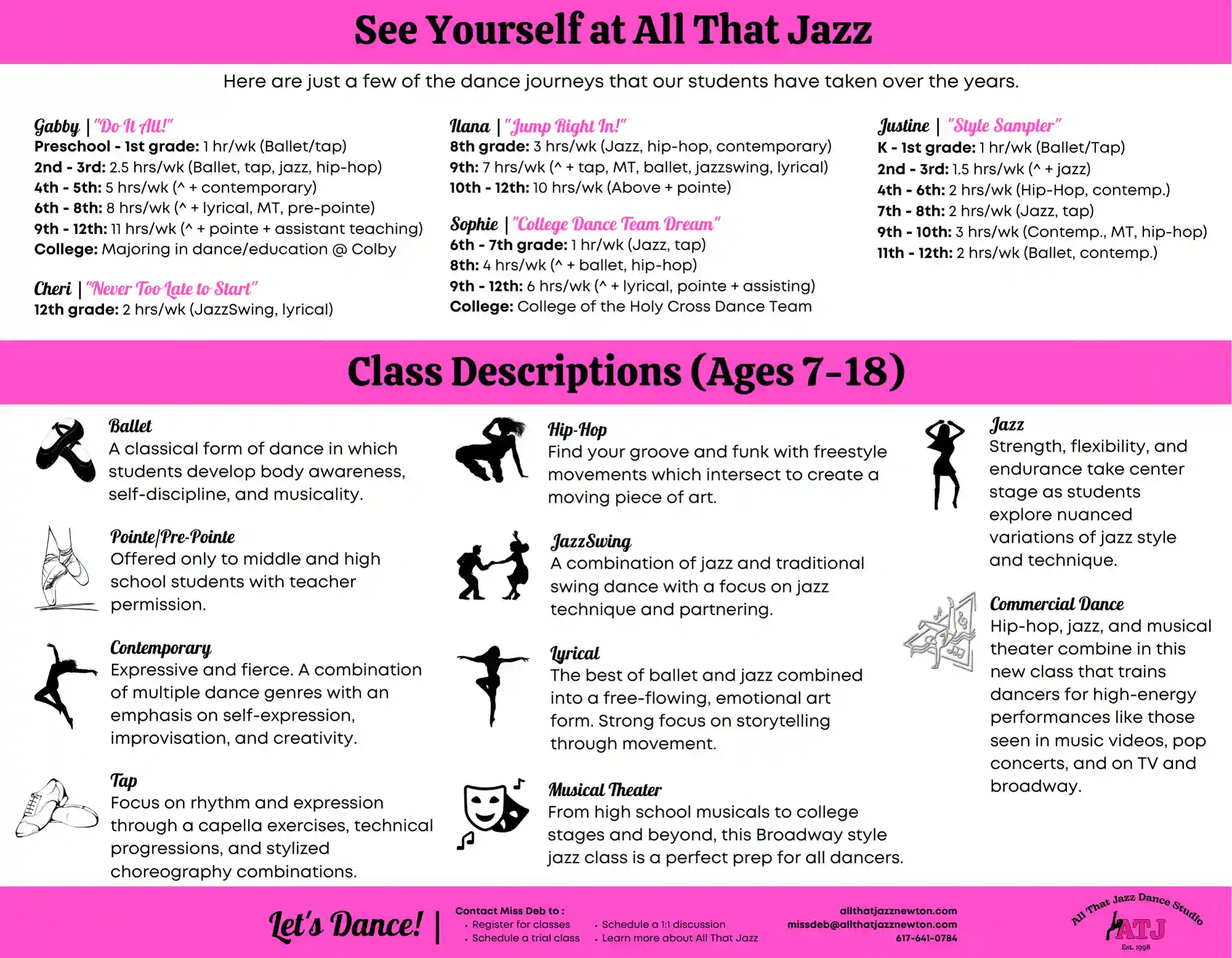 All That Jazz Dance Studio in Newton has many different amazing class options for your child. If you would like help choosing the perfect class for your dancer, Miss Deb would be glad to help! Our dance class schedule is usually quite popular, so don’t wait to enroll. Please call 617-641-0784 or email [email protected]. If you don’t see a class time that works for your schedule, please feel free to make a suggestion.